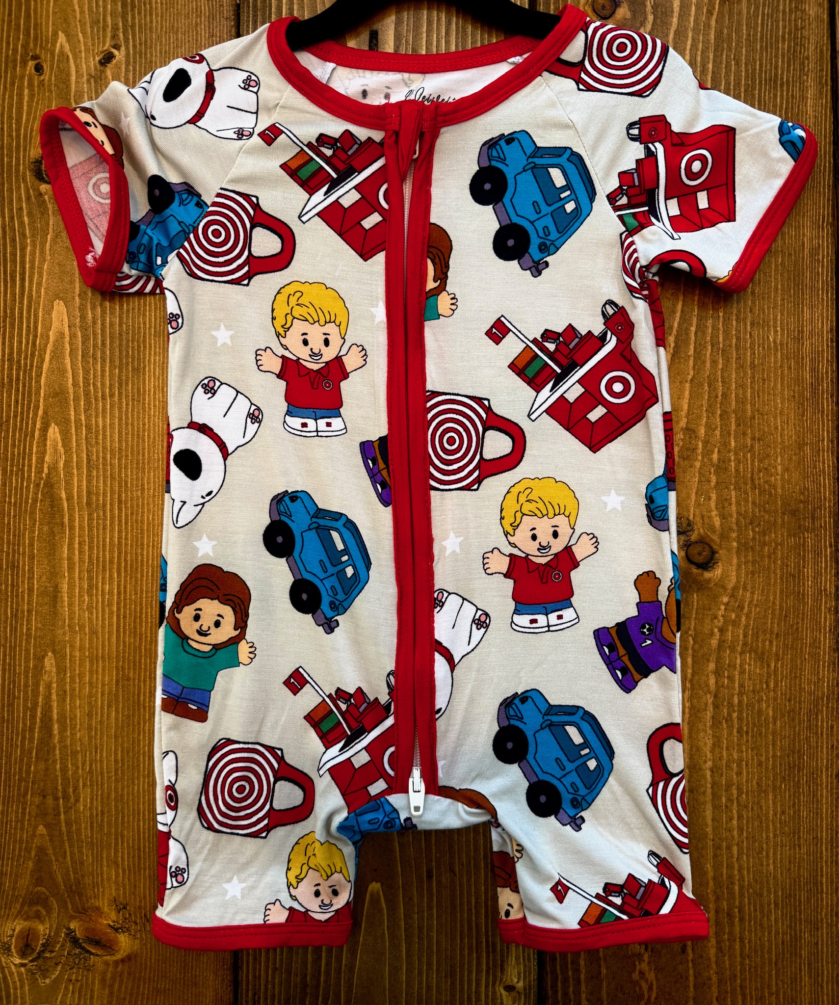 The Little Market Crew Bamboo Shortie Sleeper features a playful shopping-themed print with a cashier, shopper, retail bags, and a friendly store pup. Made from premium bamboo fabric with vibrant, long-lasting prints.